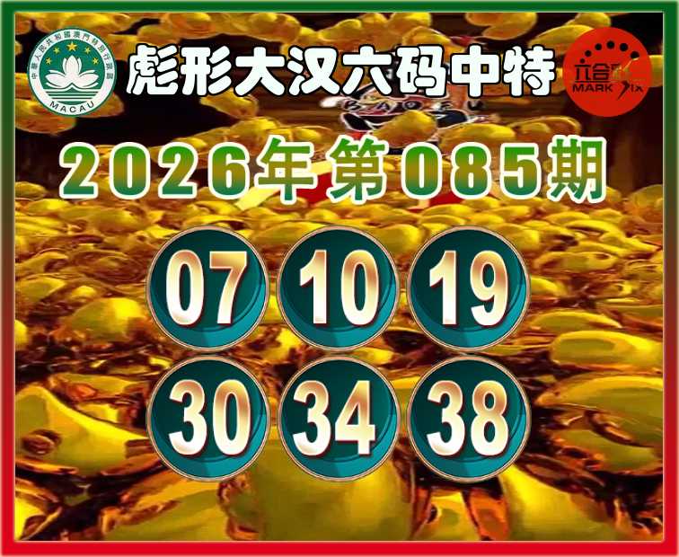 085期:〖彪形大汉〗 六码中特【07.10.19.30.34.38】开:19