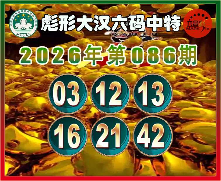 086期:〖彪形大汉〗 六码中特【03.12.13.16.21.42】开:12
