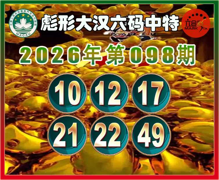 098期:〖彪形大汉〗 六码中特【10.12.17.21.22.49】开:17